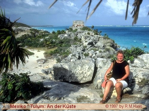 TulúmTulúm unterscheidet sich von den anderen Maya -Städten gewaltig. Als erstes fehlt hier direkt an der Küste der Urwald. Man sieht vom Eingang aus die Stadt vor sich liegen und dahinter das Meer und den Horizont. Direkt mit dem Rücken zur Steilküste liegt die Hauptpyramide. Als die Spanier von der See her anrückten, muss das ein gewaltiger Anblick gewesen sein, denn das Gebäude war hinten wahrscheinlich rein weiß!